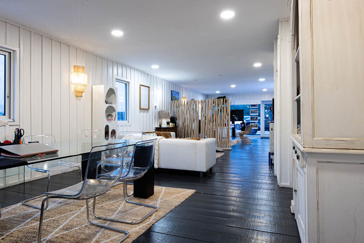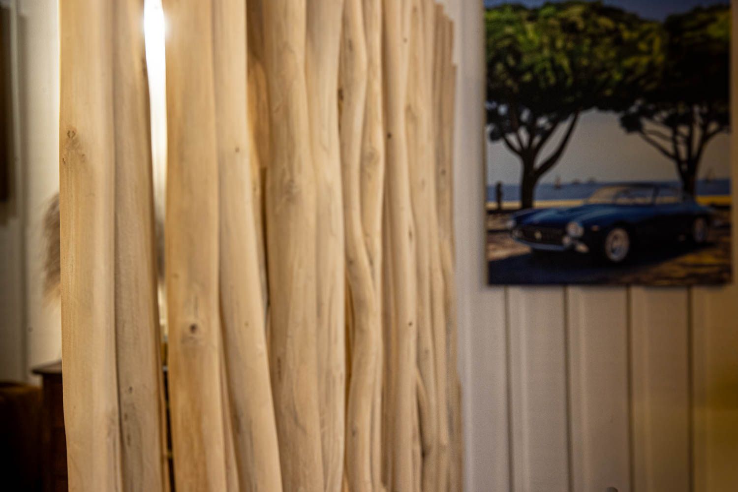 Il a fallu penser à l agencement d' une cloison en bois flotté pour séparer l' espace accueil de l‘ espace salon, dans le but de préserver l' intimité des clients et de la personne en charge du secrétariat.